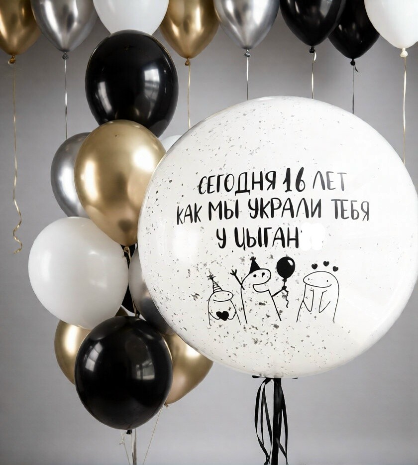 Фонтан из 10 шаров-1 штШар гигант с надписью" Сегодня 16 лет, как мы купили тебя у цыган.""Сегодня 16 лет, как мы нашли тебя в капусте""Сегодня 16 лет, как мы выкопали тебя вместе с картошкой"