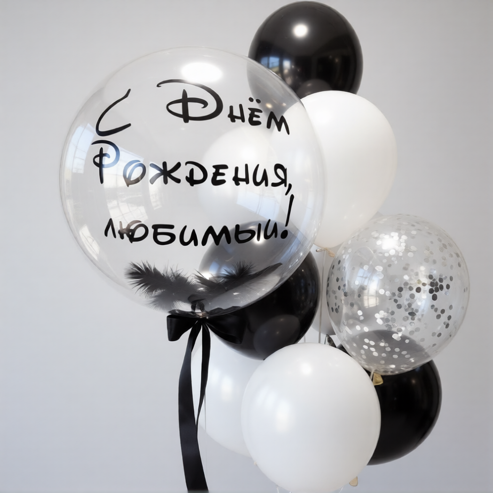 В наборе 11 шаров:Прозрачный шар сфера с надписью и перьями-1штИ Фонтан из 10 шаров:Латексные шарики без рисунка черные белые, серебро хром - 8 шт.Шарики с конфетти -2 шт.Грузик - 1 шт.