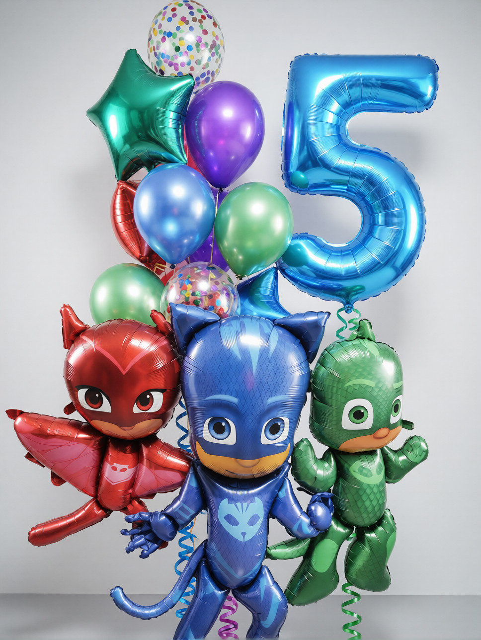 1 . фонтан из 10 шаров2. фольгированная цифра 5 - 1шт3.Фигура большая герои в масках