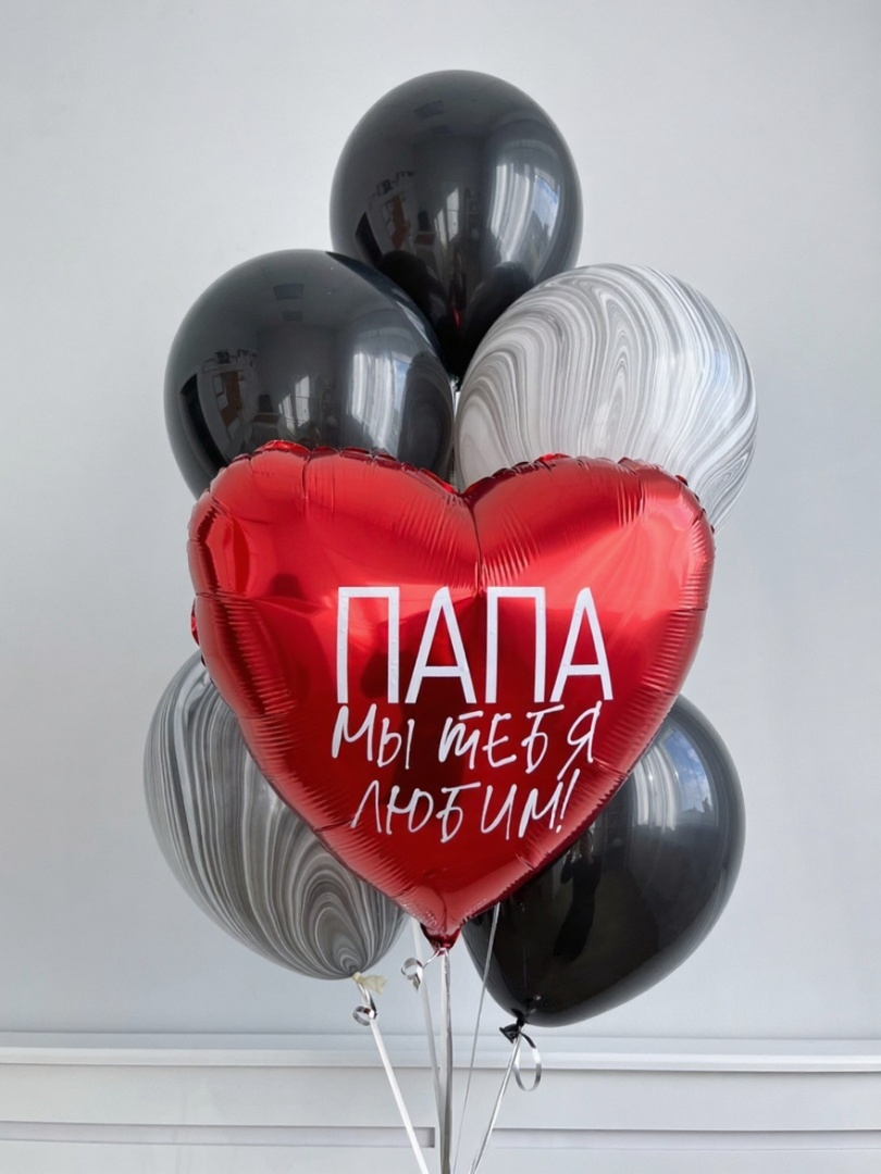 Фонтан из 7 шаров:Сердце фольгированное красное с надписью для папа- 1 штНадпись - Папа , мы тебя любим!шары черный агат - 2 штшары латексные черные пастель- 4 штуки