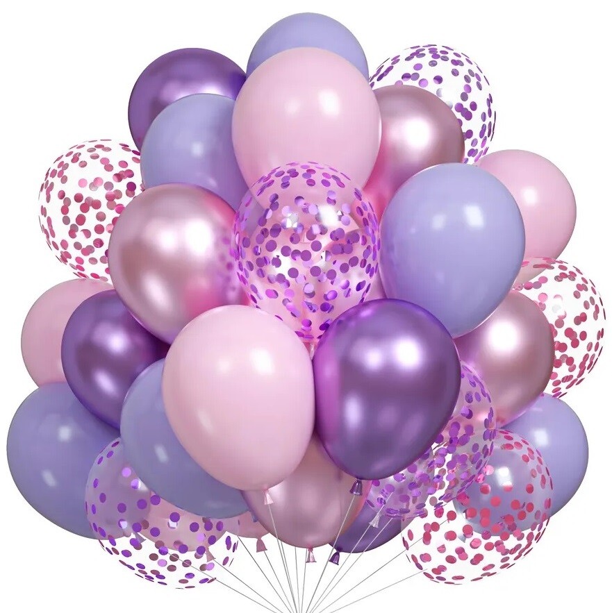 Воздушные шары с гелием в количестве 10шт:розовые пастель - 2 штсиреневые пастель -2 штрозовый хром -1 штсиреневый хром -2 штшары с розовым конфетти -2штшары с сиреневым конфетти - 1 шт