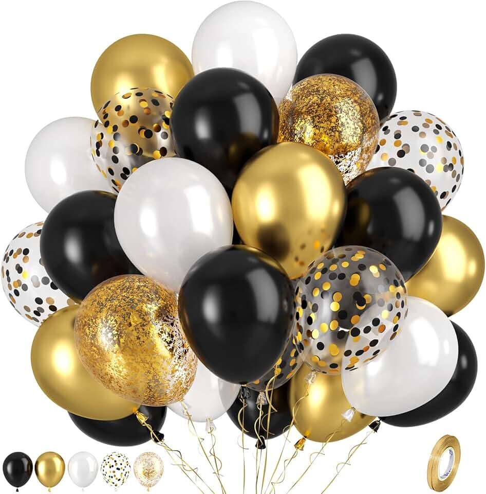 Набор шаров- золотые хром, черные и белые, с конфетти
