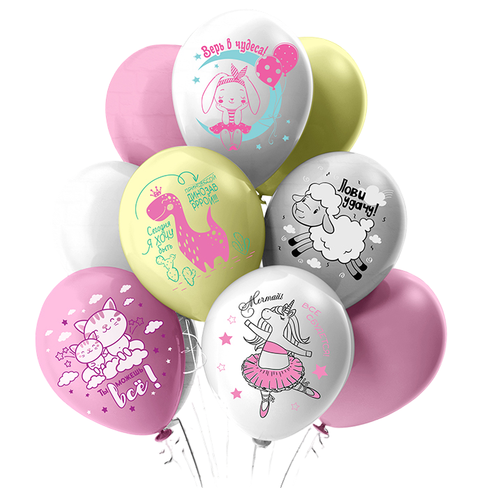 Шары нежных пастельных тонов для девочек с пожеланиями:Мечтай, все сбудетсяВерь в чудесаЛови удачуТы можешь ВсёЦвет шаров- розовые, серые, белые, айвори