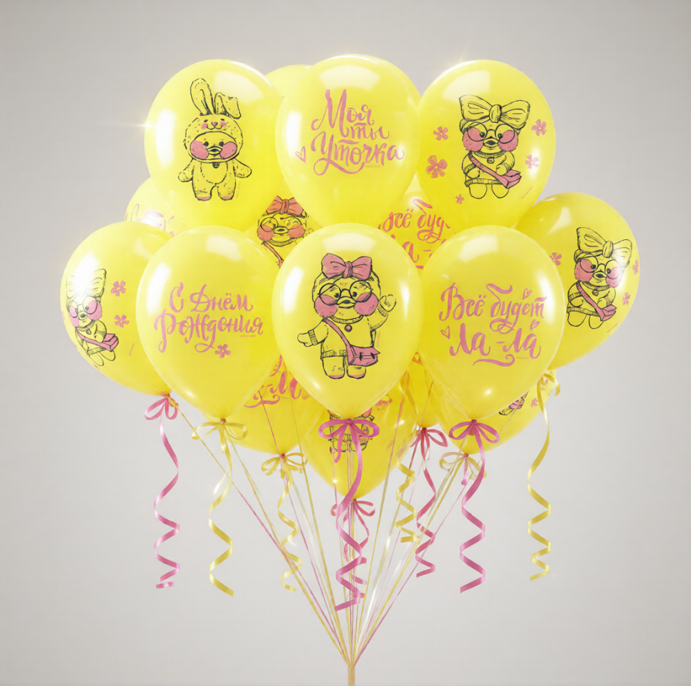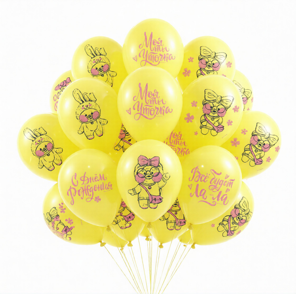 Желтые шары с рисунком уточка ЛаЛа ФанФан и надпись С Днем Рождения.Для девочек